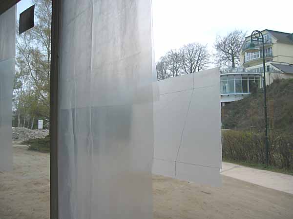 So wird der Raumklang, den der Betrachter in der Usedomer-Hängung wahrnimmt, weniger von einer Ansammlung begrenzender, gestalterischer Elemente bestimmt.. Was sich hier zeigt und möglicherweise nur für Momente Gestalt annimmt, ist der Entwurf einer Befindlichkeit, die dort angesiedelt ist, wo neue und fremde Raumpositionen auftauchen. Sicherlich ein Lebenprinzip, das über die Grenzen jeglicher Fixierung hinausgeht, doch nur auf diese Weise sind Weit-Räume erfahrbar, ’im zugleich ganz und gar außer sich und ganz nah bei sich sein’.