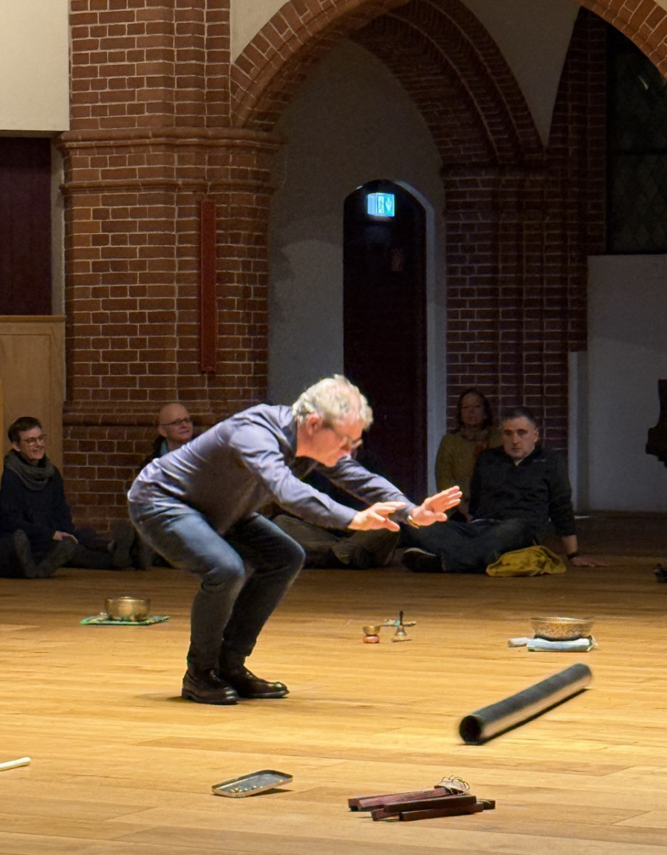 Die Performance „Augenblicke“ versteht sich als Experiment und versucht, genau das auszukosten, was der Titel benennt. Gearbeitet wird mit der menschlichen Stimme, dem Raum, der vergehenden Zeit und allerlei Klängen. Immer geht es um den erfüllten Augenblick, um eine Kunst des Verweilens. Erst durch ein solches Innehalten wird das Leben davor bewahrt, in unzählige Augenblicke zu zerfallen, die nichts miteinander zu tun haben, einander nichts angehen und Stress erzeugen. Die Performance „Augenblicke“ versucht dagegen, ein Netz aus Beziehungen zu flechten. Augenblicke werden so zu Ausblicken, Einblicken und Rückblicken.