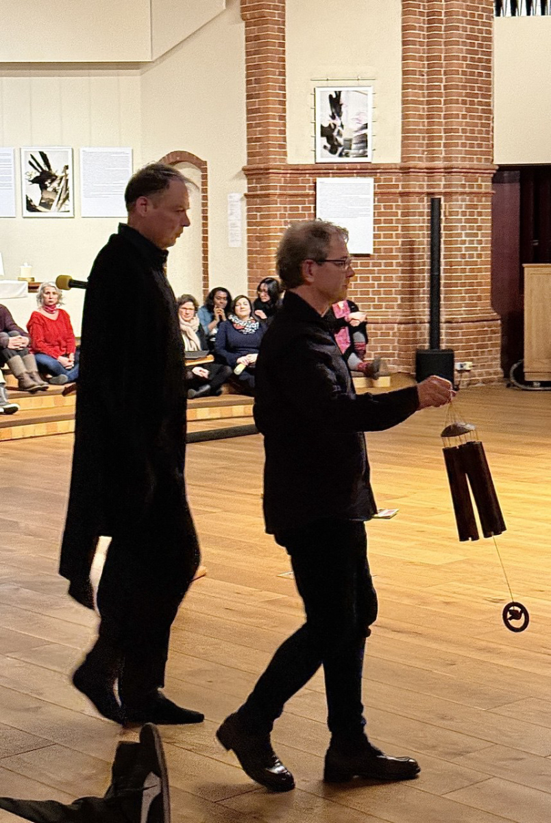 Die Performance „Augenblicke“ versteht sich als Experiment und versucht, genau das auszukosten, was der Titel benennt. Gearbeitet wird mit der menschlichen Stimme, dem Raum, der vergehenden Zeit und allerlei Klängen. Immer geht es um den erfüllten Augenblick, um eine Kunst des Verweilens. Erst durch ein solches Innehalten wird das Leben davor bewahrt, in unzählige Augenblicke zu zerfallen, die nichts miteinander zu tun haben, einander nichts angehen und Stress erzeugen. Die Performance „Augenblicke“ versucht dagegen, ein Netz aus Beziehungen zu flechten. Augenblicke werden so zu Ausblicken, Einblicken und Rückblicken.