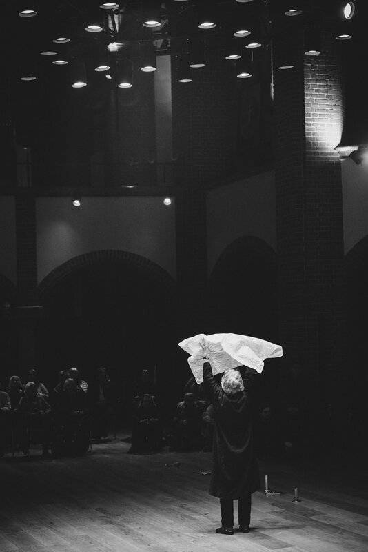 Die Performance „Augenblicke“ versteht sich als Experiment und versucht, genau das auszukosten, was der Titel benennt. Gearbeitet wird mit der menschlichen Stimme, dem Raum, der vergehenden Zeit und allerlei Klängen. Immer geht es um den erfüllten Augenblick, um eine Kunst des Verweilens. Erst durch ein solches Innehalten wird das Leben davor bewahrt, in unzählige Augenblicke zu zerfallen, die nichts miteinander zu tun haben, einander nichts angehen und Stress erzeugen. Die Performance „Augenblicke“ versucht dagegen, ein Netz aus Beziehungen zu flechten. Augenblicke werden so zu Ausblicken, Einblicken und Rückblicken.